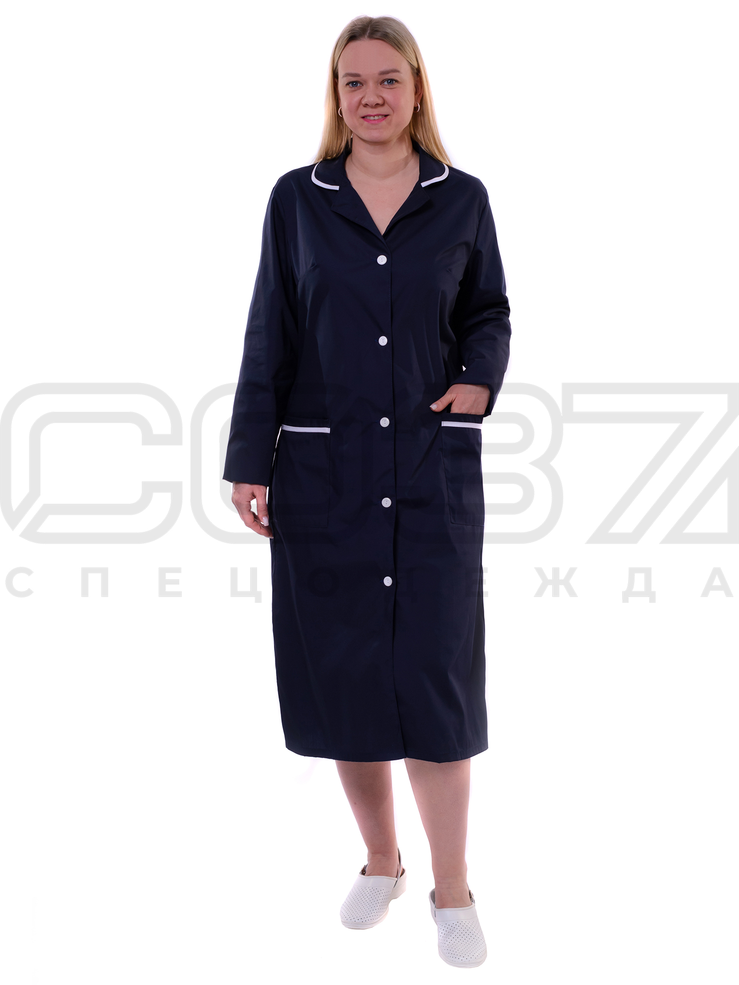 Халат рабочий женский цв.тёмно-синий/белый кант тк.тиси в Мариуполе